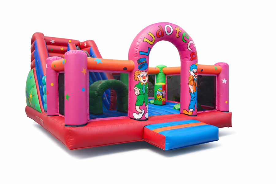Hinchable ludoteca para niños entre 2 y 10 años cuenta con varios obstaculos un espacio de 2 x 2 en el interior para los mas pequeños y unas escaleras para acceder al tobogan cerrado con red para poder ver a los niños desde fuera. MEDIDAS 5 x 6 METROS